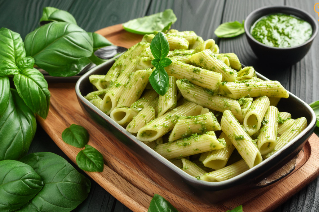 Taze fesleğen, zeytinyağı ve parmesanla hazırlanan pesto sos eşliğinde penne rigate. Ferah ve yoğun aromalı bir tat.